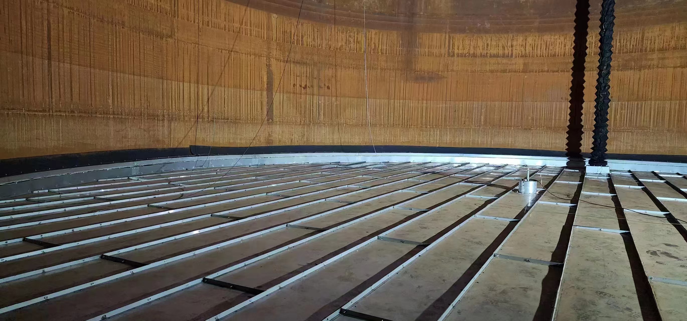 組裝式不銹鋼內浮盤采用了井字形結構。即浮盤的骨架成井字形;所用材料均為不銹鋼材質,增加浮盤的整體結構強度,相應延長了浮盤的使用壽命。
